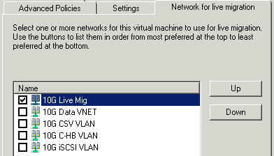 Click the Network for live migration tab, and select one or more cluster networks to use for live migration. Use the buttons on the right to move the cluster networks up or down to ensure that a private cluster network is the most preferred. The default preference order is as follows: networks that have no default gateway should be located first; networks that are used by cluster shared volumes and cluster traffic should be located last.