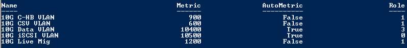 - Get-ClusterNetwork | ft Name, Metric, AutoMetric, Role