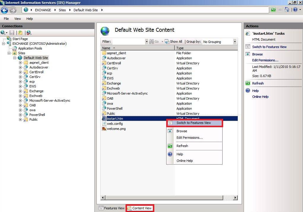 - In IIS Manager, highlight the Default Web Site (DWS) and on the center pane, click on contents view. Right click on iisstart.htm and then select Switch to features view.