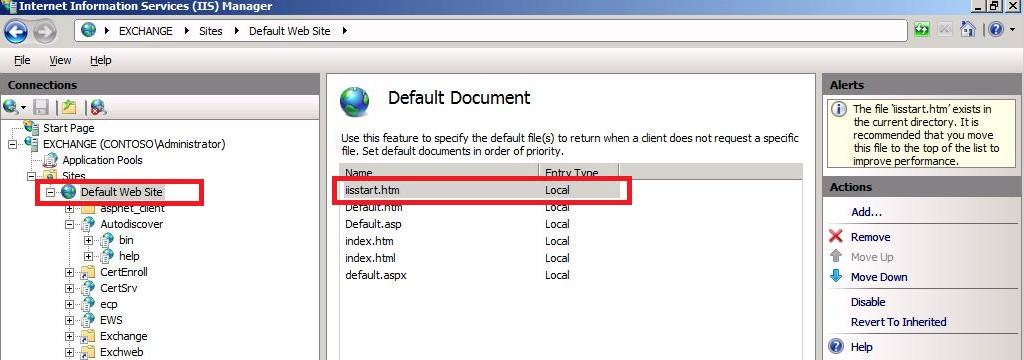 - Now return back to the Default Web Site and select Default Document in the features view. You should have iisstart.htm listed over here. Select it and move it to the very top of the list as per Screenshot 4.