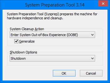 • Choose options as per the image above, and then click OK. Sysprep will take about 5-10 minutes and will shutdown upon competition. When the computer shuts down, don’t power it back up, as you will need to first boot from the CD/DVD ROM using the WinPE CD.