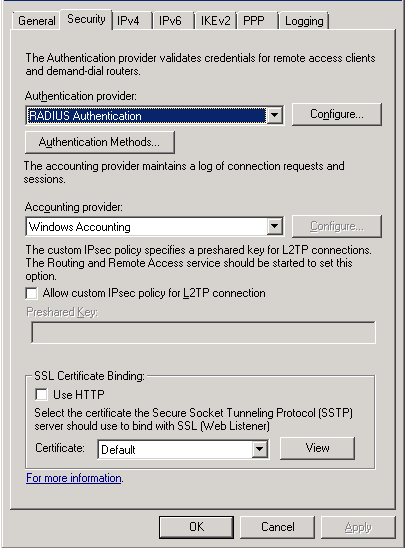 The following guide will show you how to setup a secure VPN connection using encryption. You will need only Windows Server 2008 R2, with the Network Policy and Access role, including Routing and Remote Access and Network Policy Server. You will also need to allow the VPN port 1723 through your firewall as a NAT rule, pointing this to the Routing and Remote Access server.