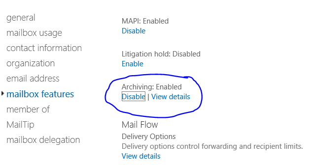 We have an Exchange 2010 SP3 Hybrid setup with Office 365 and have directory synchronization turned on. We tried to enable email archiving for a migrated user in the cloud using the Exchange Control Panel.