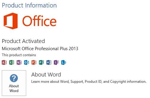 In comparison, the ‘about’ screenshot on an Office 365 installation is slightly different, nowhere does it say Office 2013.