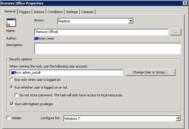 Create a user based group policy and map it to the OU which contains your users. Create a scheduled task, I called this Remove Office. Change the account that is used for the running of the task to the account you setup before and enter in the password when it prompts.