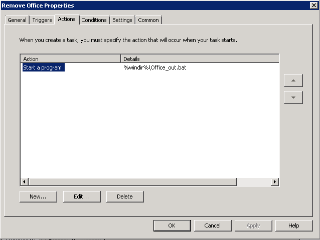 For the action, add in “%windir%\Office_out.bat”