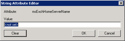 - Find the attribute msExchHomeServerName, then clear this value > click OK.