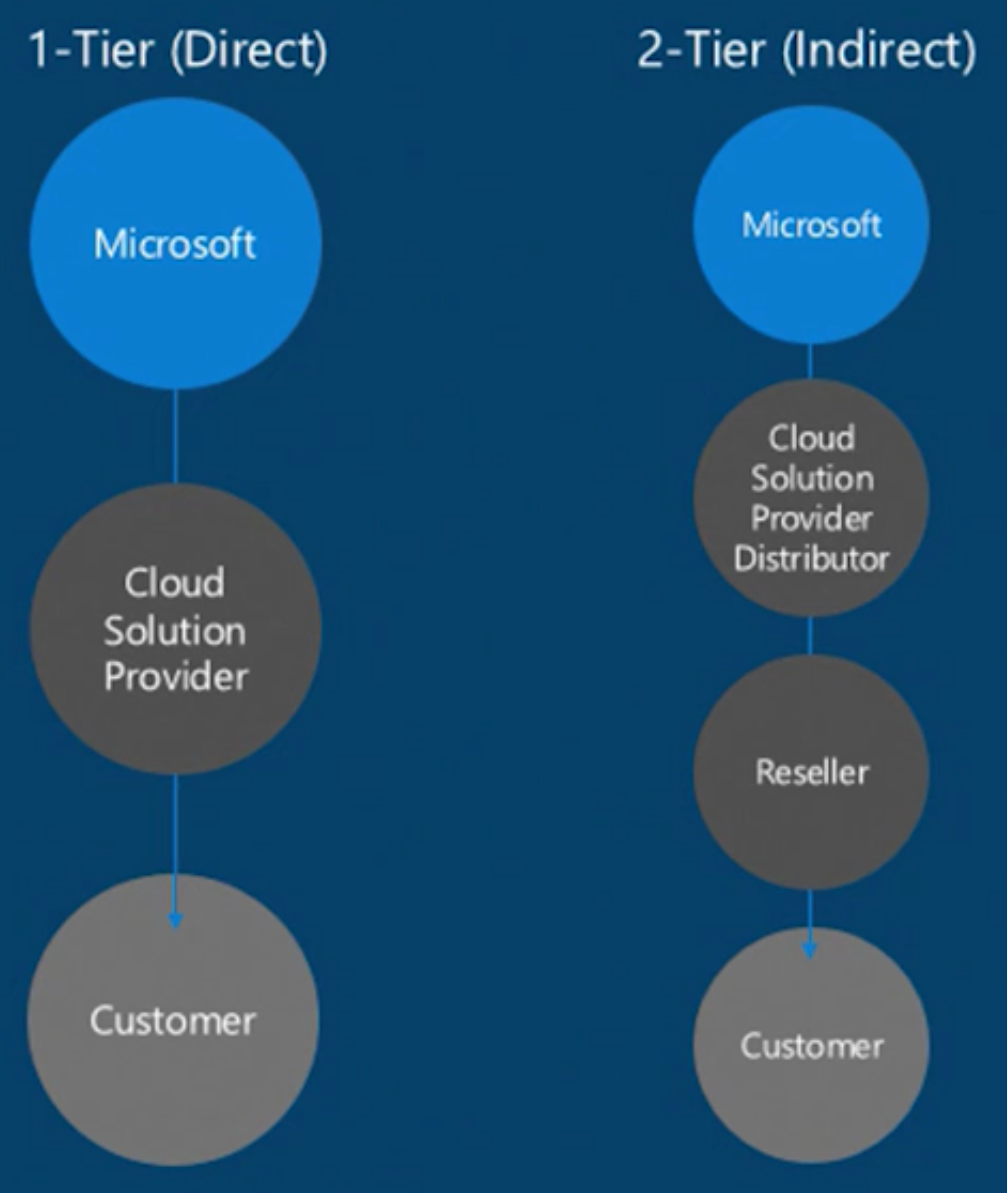 Indirect (2-tier) – Distributors or hosters who provide the relationship to the end reseller on behalf of Microsoft. Some resellers might want to build their cloud solution business but don’t want to invest in the infrastructure that it would take to build out the appropriate support or partner billing models.