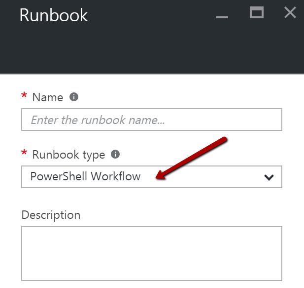 Next thing to do is setup a new runbook, make sure you choose ‘PowerShell Workflow‘.