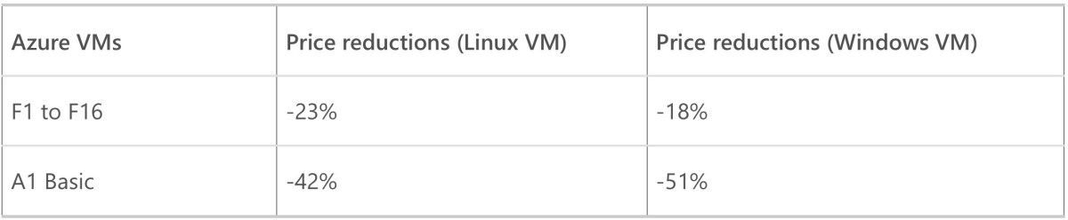 Last year Scott Guthrie himself said that Microsoft would no longer compete on price and compete on value instead. However Microsoft have finally dropped prices on some of their virtual machines. Microsoft’s F1-16 series of VM’s are up to 26% cheaper, while the A1 series is about 51% cheaper. This combines with Azure Blob Hot and Cold storage cuts of 38 and 26 percent, respectively