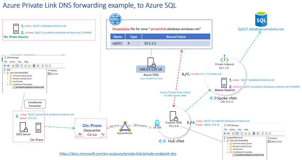 From here, the DNS forwarding & resolution this does exactly the same as before. However, the only difference here means that you can make use of split DNS, leverage an Azure internal DNS zone. Rather than Sql321.privatelink.database.windows.net resolving to a public CNAME record, you can have Sql321.privatelink.database.windows.net resolving to a private IP address (Private Link).