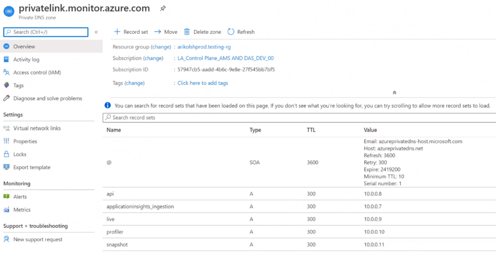 While this exact Private Link DNS redirection is true for most Azure PaaS services, it’s slightly different for Azure Monitor/Log Analytics, due to other underlining URLs in which the MMA (Microsoft Management Agent) uses and the generic nature of the other primary Azure Monitor URLs. Azure Monitor is slightly unique whereas some of the Azure Monitor URLs are global DNS entries the same for all customers and are not customer specific (e.g. monitor.azure.com), hence the reason to use the AMPLS (Azure Monitor Private Link Scope) which then makes it more customer specific. In comparison from above, the URL Sql321.privatelink.database.windows.net is customer specific.
