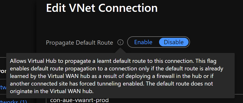 Allows Virtual Hub to propagate a learnt default route to this connection. This flag enables default route propagation to a connection only if the default route is already learned by the Virtual WAN hub as a result of deploying a firewall in the hub or if another connected site has forced tunneling enabled. The default route does not originate in the Virtual WAN hub.